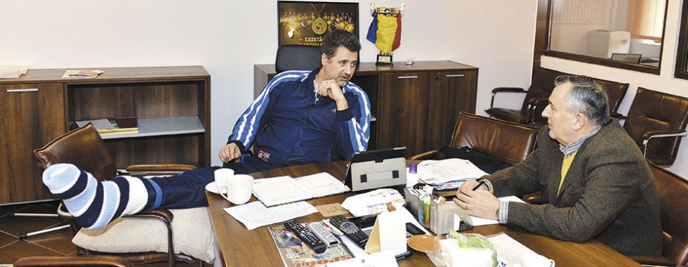 Alexandru Dedu, cu piciorul drept bandajat, în timp ce purta un dialog cu cunoscutul jurnalist sportiv Dumitru Graur