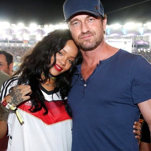 Rihanna a făcut senzaţie în tribună şi toţi ochii s-au aţintit asupra ei atunci când a fost în Brazilia, inclusiv cei ai lui Gerard Butler. Artista s-a fotografiat alături de Butler în timp ce susţinea echipa Germaniei şi l-a curpins pe actor de mijloc, zâmbind provocator. Acesta pare să se simtă bine în compania brunetei şi o ţine foarte aproape de pieptul lui. Oare s-a legat o idilă pe stadionul de fotbal?