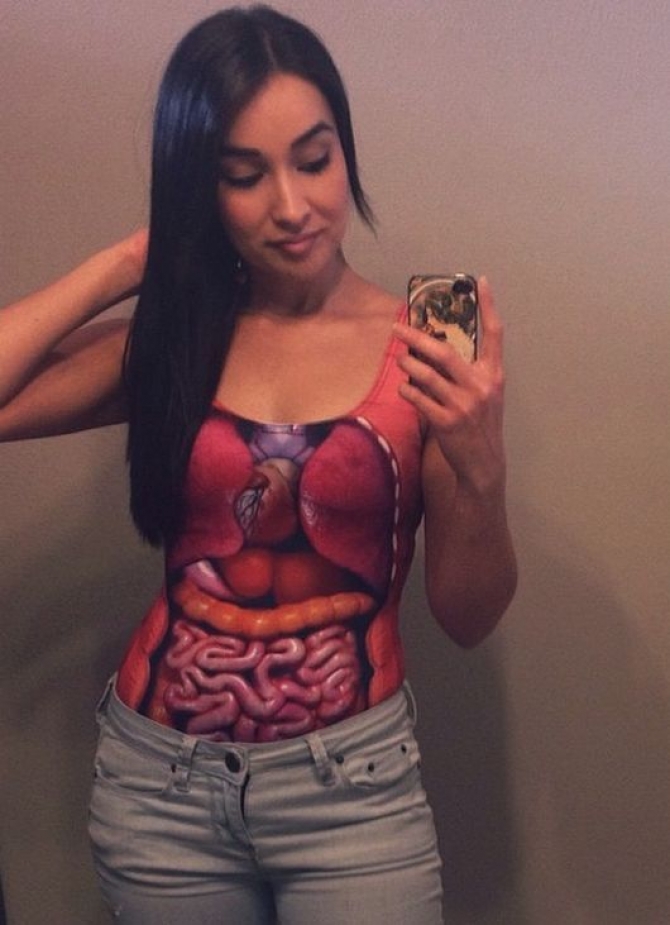 Costumul este unul inedit, însă nerecomandat celor cu stomacul sensibil. El înfăţişează structura internă a omului, felul în care sunt aşezate organele în organism. Cu toate că nu e potrivit pentru toate femeile, obiectul vestimentar va întoarce cu siguranţă multe capete.