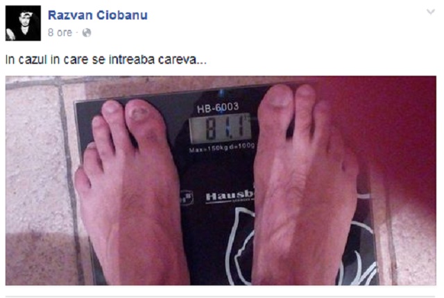 Fericit că regimul alimentar dă rezultate, Ciobanu a postat pe o reţea de socializare o fotografie prin intermediul căreia a vrut să le arate prietenilor lui virtuali cât mai cântăreşte. Un detaliu i-a scăpat însă din vedere: unghiile de la picioare, care au un aspect total nesănătos!