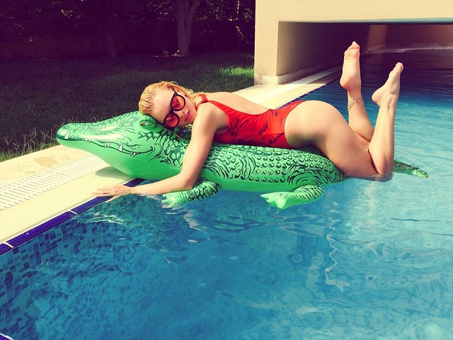 În imagine, Alexandra Stan stă întinsă pe burtă pe un crocodil gonflabil. Prietenii ei virtuali de pe Facebook i-au putut admira formele, dar şi fundul bombat.
