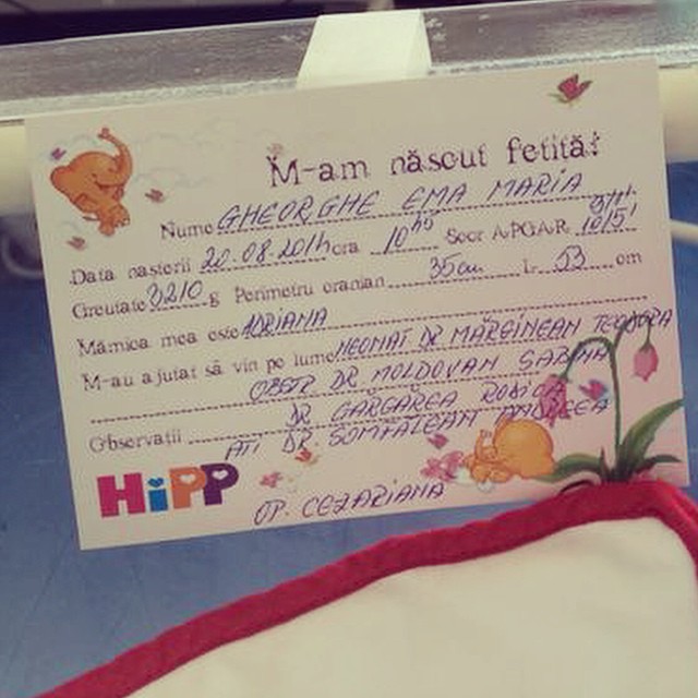 Micuţa se va numi Ema şi se pare că s-a lăsat aşteptată puţin de cei dragi. Bebeluşul s-a născut astăzi, la ora 10:45, şi are o greutate de 3,210 kg.