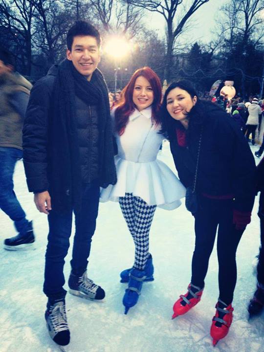 Îmbrăcată cu un palton alb foarte şic, cu o pereche de colanţi în carouri şi cu patine în picioare, Elena Gheorghe este veselă de ieşirea pe gheaţă.
