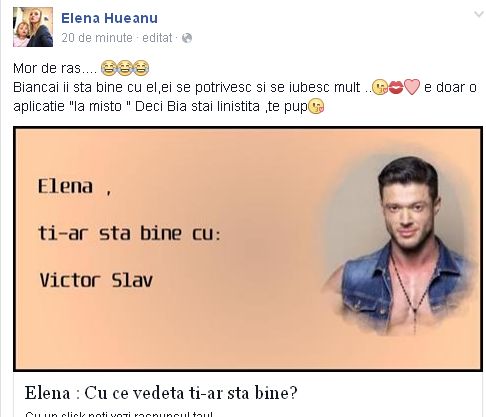 "Mor de ras. Biancăi îi stă bine cu el, ei se potrivesc şi se iubesc mult. E doar o aplicaţie "la misto ". Deci Bia stai liniştită. Te pup", a scris Elena Hueanu pe o reţea de socializare.