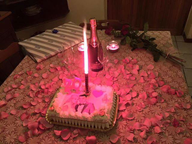 Cristian şi-a copleşit iubita cu numeroase cadouri printre care un tort imens, dar şi câteva imagini cu cei doi. Nu au lipsit nici florile, Elly primind un buchet foarte frumos de trandafiri.