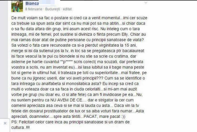 Bianca, prietena Anei a postat pe Facebook luna trecută, la doar o zi după ce Ana a intrat în casă, un mesaj plin de vorbe urâte care erau despre Elly. Când a văzut mesajul, Ana a rămas fără cuvinte.