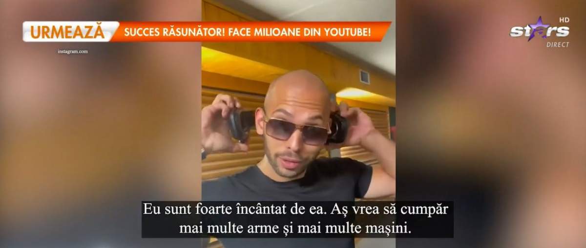 Încântat de noua achiziție și dornic să facă o altă aroganță, Cobra Tate a filmat momentul în care a pus-o la încercare și le-a povestit urmăritorilor de pe Instagram cât de specială este. ”Jucăria” afaceristului este, de fapt, o armă care există în ediție limitată și de care milionarul este cât se poate de mândru.