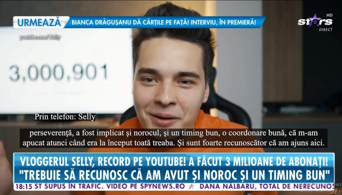Selly a reușit ceea ce niciun alt vlogger din România nu a putut până în momentul actual. Tânărul a făcut 3 milioane de abonați pe canalul său de YouTube. La cei 20 de ani pe care îi are, Andrei Șelaru recunoaște că atunci când s-a apucat de vlogging nu se gândea că o să aibă un succes atât de mare.