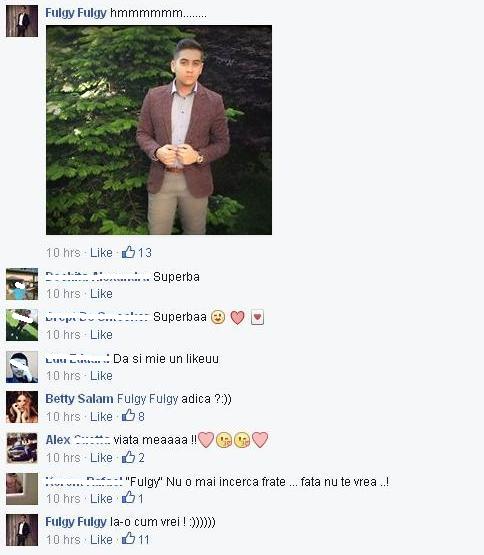 Băiatul Clejanilor i-a comentat fiicei lui Salam la cea mai recentă fotografie postată pe Internet, după care discuţia dintre ei a continuat. Deranjat probabil de atitudinea lui Fulgy, Marco (n.r.- Alex, pe numele de pe Facebook) s-a băgat şi el în discuţie spunându-i că este viaţa lui, moment în care simpaticului artist i s-a cam luat cheful şi a terminat brust discuţia: "Ia-o cum vrei...".