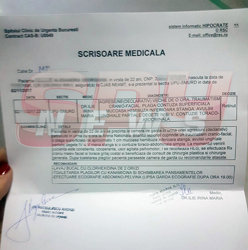 În urma scandalului din toaleta stadionului, Ada, victima soţiilor bătăuşe s-a ales cu mai multe traumatisme, atât la nivelul capului, cât şi al membrelor, tânăra fiind transportată de o prietenă la Spitalul Floreasca din Capitală, acolo unde medicii i-au acordat primul ajutor. Conform raportului medical, presupusa amantă s-a ales cu traumatism cranio-facial, avulsii unghiale la degetele patru şi cinci de la mâna stângă şi îndex la mâna draptă, dar şi o contuzie toraco-abdominală.
