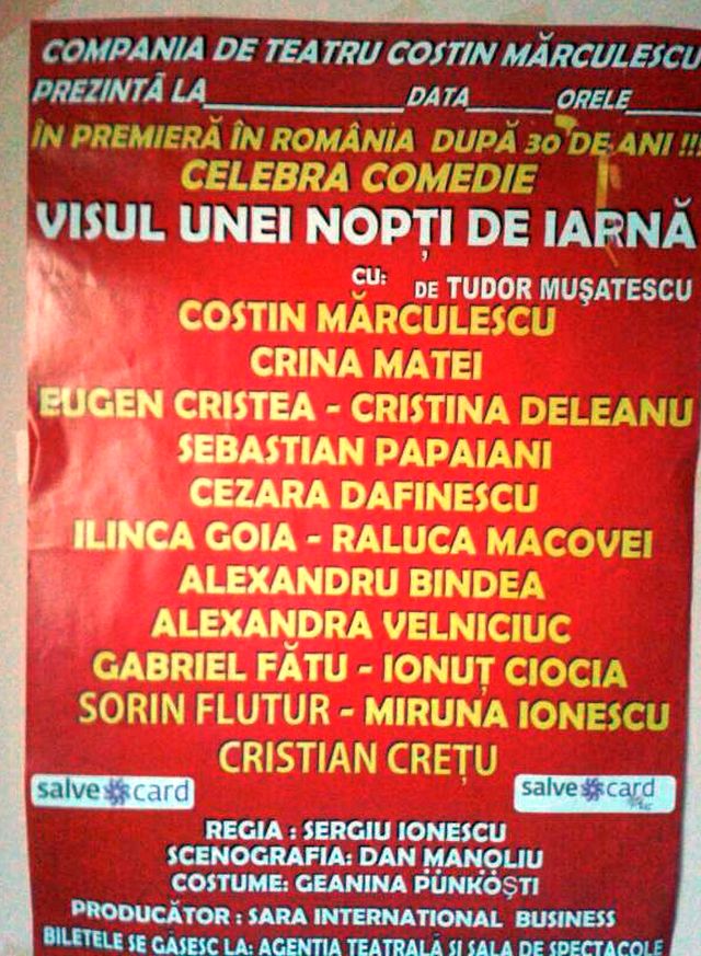 A chemat nume sonore din teatru, le-a promis marea cu sarea, iar după două luni, s-a văzut în ipostaza în care nu avea cu ce să-i plătească pe cei pe care îi invitase să joace în „Visul unei nopţi de iarnă” de Tudor Muşatescu. Împreună cu alţi doi asociaţi, o femeie şi un bărbat, Costin Mărculescu a crezut că va da lovitura cu spectacolul său, însă nu a fost nici pe departe aşa.