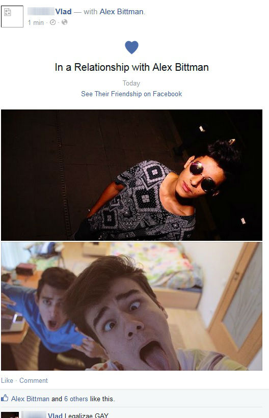 Alex Bittman şi un prieten de-ai săi au anunţat că sunt într-o relaţie. Cu toate că mesajul pare a fi scris în glumă, amicul lui a şi lăsat un comentariu care sugerează că ar vrea o "legalizare" a relaţiilor homosexuale. Cei doi protagonişti n-au mai explicat deloc postarea ieşită din comun, însă prietenii lor le-au lăsat o mulţime de comentarii. "Acum ştiu 100% că eşti homosexual", a scris unul dintre ei, pe Facebook.