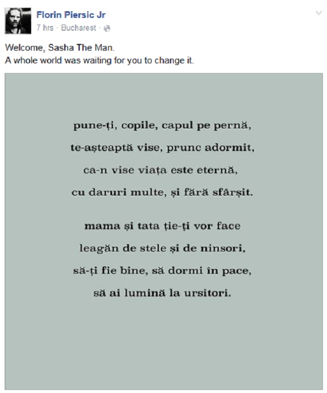 Florin Piersic jr. (47 ani), care mai are o fetiţă din relaţia pe care a avut-o cu actriţa Dorina Chiriac, a anunţat venirea pe lume a fiului său, pe Facebook, la scurt timp, după ce iubita sa a născut.