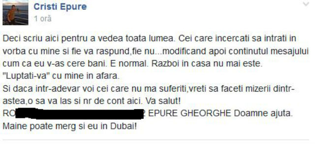 RO76 **** **** **** **** **** EPURE GHEORGHE Doamne ajuta. Maine poate merg si eu in Dubai!", a scris fostul concurent pe reţelele de socializare.