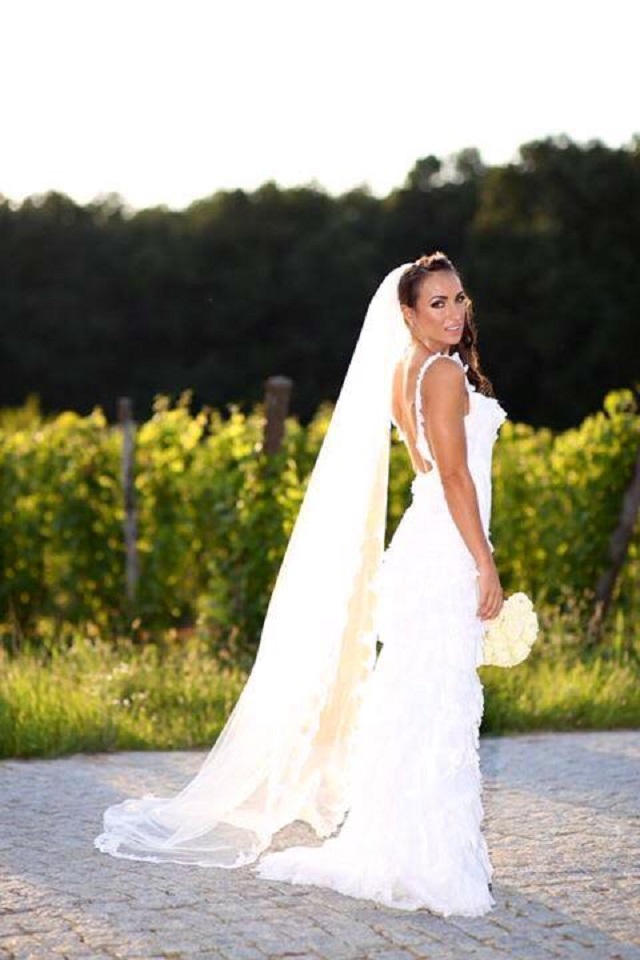 Miss World Fitness a ales să poarte o coafură asimetrică și un voal foarte lung, brodat cu dantelă. Dantela este unul dintre materialele preferate ale sportivei, deoarece a optat pentru acest material și în Laș Vegas, acolo unde și-a unit pentru prima oară destinele cu actualul soț.