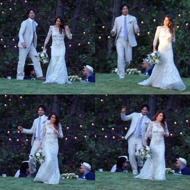 Actriţa Nikki Reed a îmbrăcat o rochie de mireasă lungă, cu spatele gol. Ea s-a asortat cu soţul ei, Ian Somerhalder care a purtat un costum alb.
