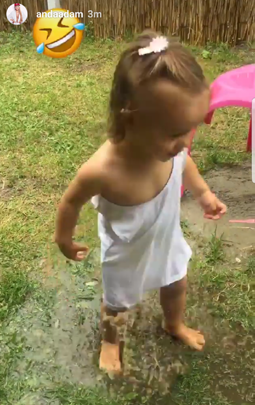 Chiar astăzi, cântăreaţa a surprins-o pe micuţa sa în timp ce se juca prin curte, în iarbă. A plouat şi încă mai plouă, iar Evelin sare prin bălţile făcute în grădină. Poartă un maiou mai lung pe ea şi o pereche de saboţi. Distracţia nu e pe măsură aşa că îşi dă şi papuceii jos.