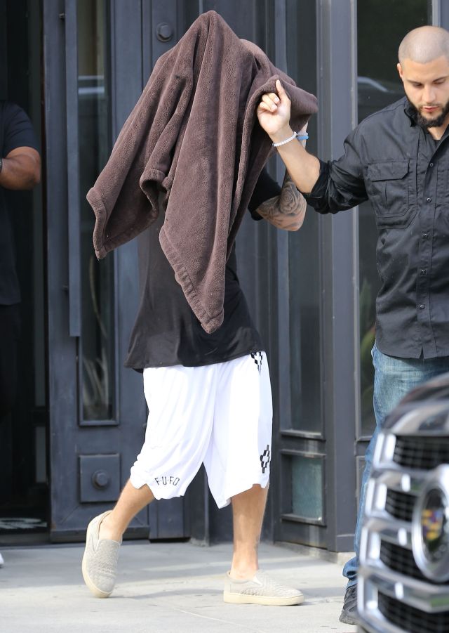 În momentul în care a ieşit din salon, Justin Bieber era atât de acoperit încât nu i se vedeau decât picioarele şi un pic din partea de sus a corpului.