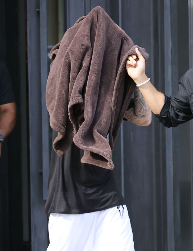 El a ieşit din clădire super camuflat, cu capul acoperit de o pătură imensă de culoare maro.