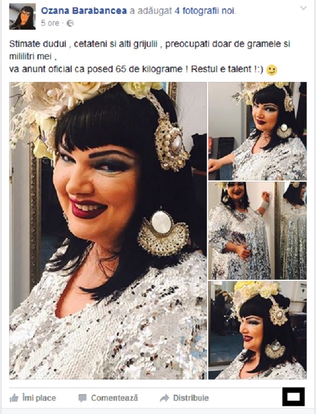 "Stimate dudui, cetăţeni şi alţi grijulii, preocupaţi doar de gramele şi mililitri mei. Vă anunţ oficial că posed 65 de kilograme! Restul e talent!" a fost mesajul Ozanei.