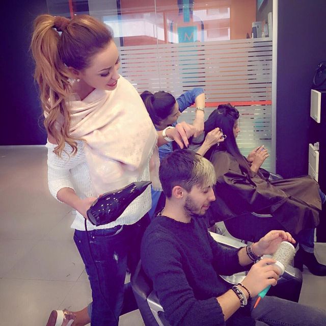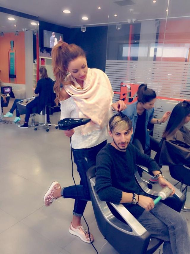 Înarmată cu un feon, ea a început să se joace în părul unui tânăr aflat pe scaunul de frizerie. Acesta a stat cuminte şi a lăsat-o pe starletă să-şi facă damblaua de a se simţi frizeriţă fie doar şi pentru câteva momente.