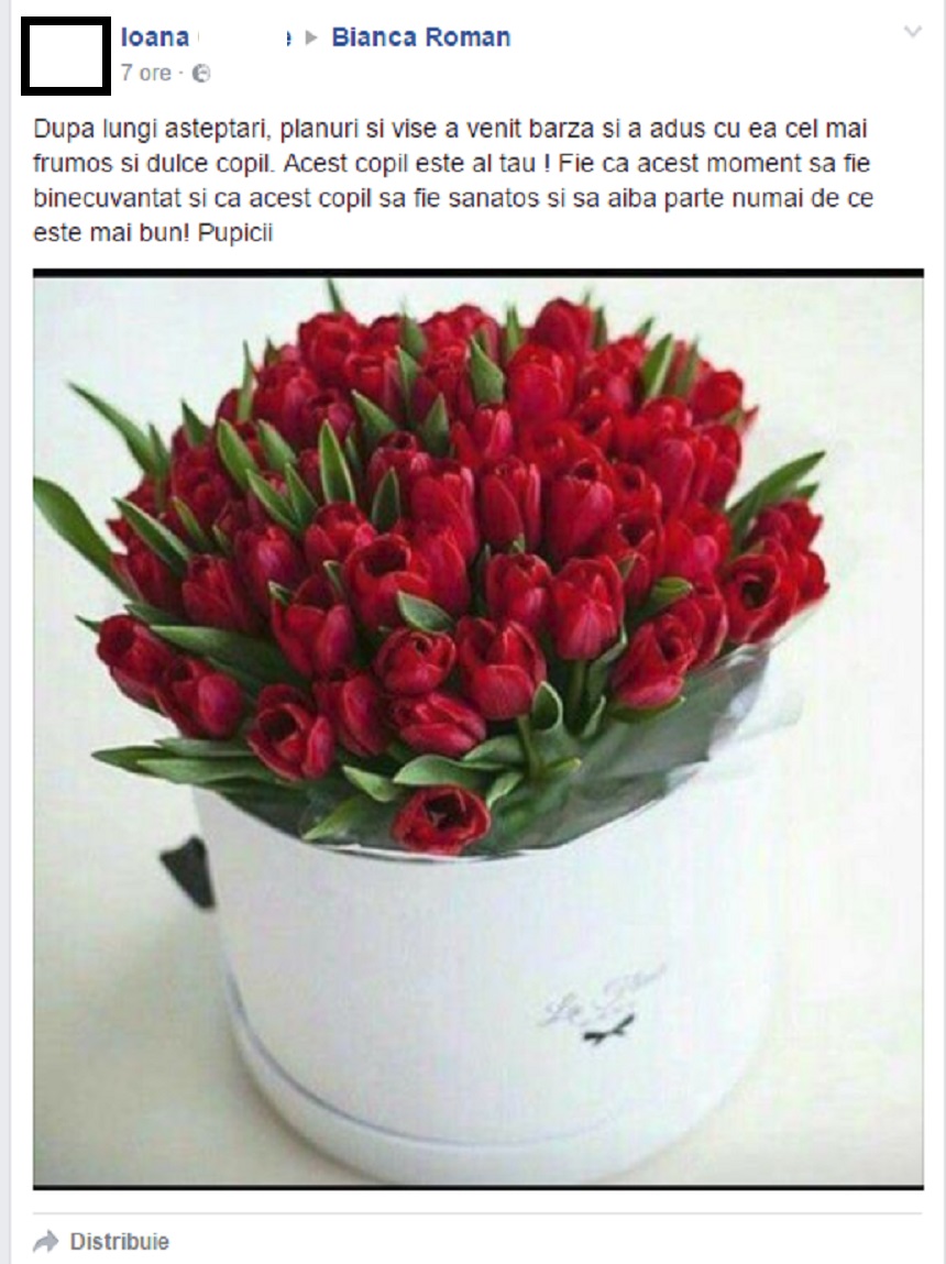 "După lungi aşteptări, planuri şi visuri, a venit barza şi a adus cu ea cel mai frumos şi dulce copil. Acest copil este al tau! Fie ca acest moment să fie binecuvantat şi ca acest copil să fie sanatos şi să aibă parte numai de ce este mai bun! Pupici", i-a scris o internaută pe contul de socializare.