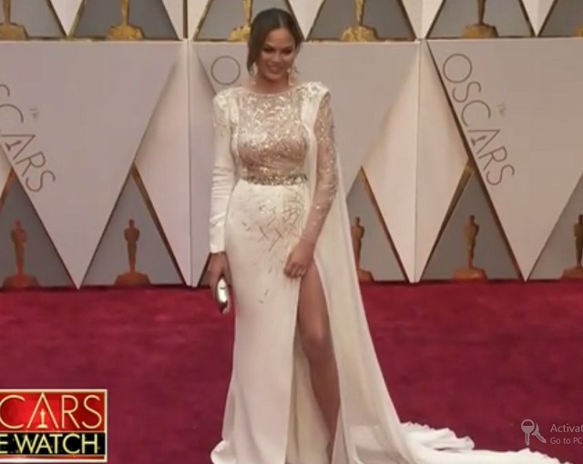 PREMIILE OSCAR 2017. Pe covorul roșu, soția cântărețului a purtat o rochie lungă, albă, cu o crăpătură adâncă pe piciorul drept. S-a comportat ca și cum nu ar avea vreo problemă și a strălucit la propriu alături de John Legend.