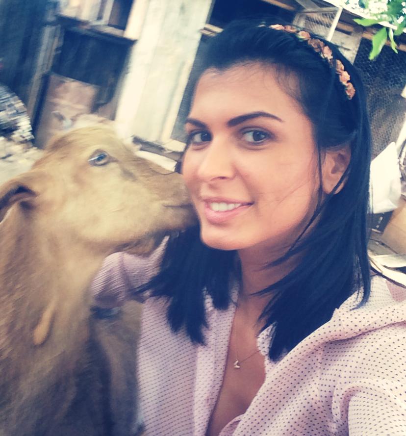 Cu zîmbetul pe buze, nemachiată şi îmbrăcată lejer, bruneta s-a bucurat de dragostea şi atenţia căpriţei nărăvaşe.