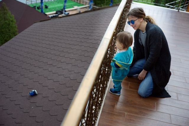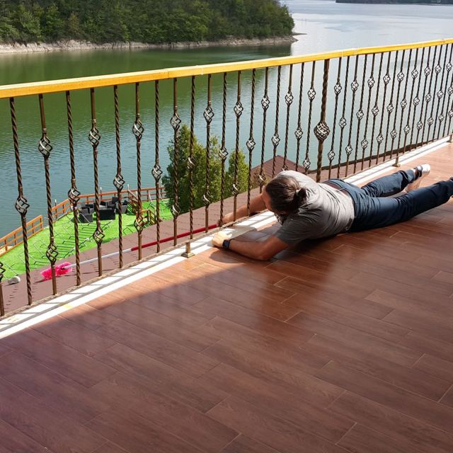 Ne-am întors în cameră cu gândul să facem niște poze de pe terasă din față camerei noastre. După ce ne-am asigurat că balustradă e ok și că nu există niciun pericol pentru Vlad, am ieșit toți 3 afară. Într-adevăr, Vlad nu are cum să se strecoare, în schimb pantoful lui da. Ce a urmata e de râs. Radu s-a chinuit vreun sfert de oră să ajungă la pantof, care a evident a că a migrat spre marginea acoperișului. A improvizat tot felul de undiţe, până când a reușit să-l împingă pe partea cealaltă.