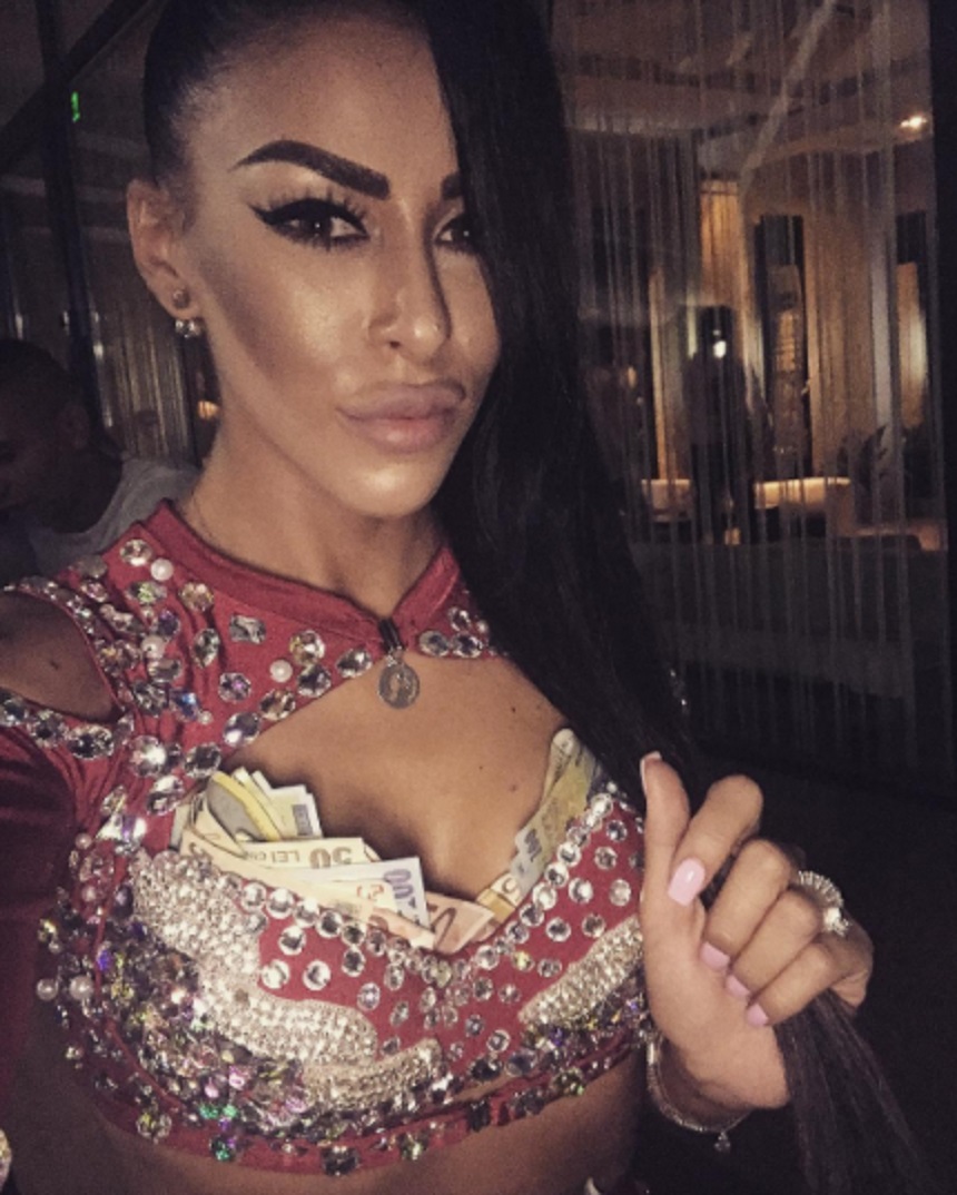 Ieri seară, dansatoarea a postat pe una dintre rețelele de socializare o imagine după reprezentație. Apare în prim plan cu decolteul plin de bani românești, dar și euro. Se poate vedea că acolo a strâns mii de lei într-o singură seară cu formele sale amețitoare, dar și mișcările care îi bagă în boală pe bărbați.