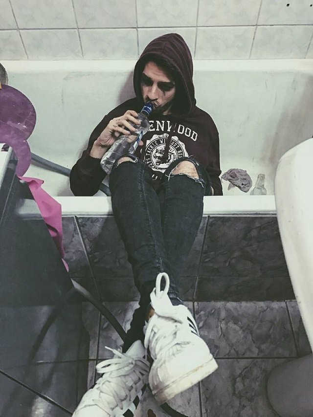 Fiul Luminiței Anghel s-a fotografiat într-o cadă murdară pe alocuri, cu o sticlă de alcool la gură. Negru în jurul ochilor, David Pușcaș pare într-o stare greu de descris.