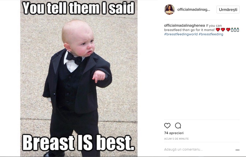 "Spune-le că am spus că sânul este cel mai bun", scrie într-o poză cu un băieţel.