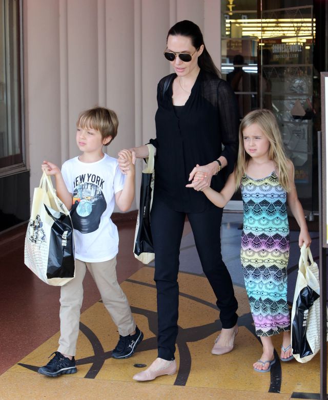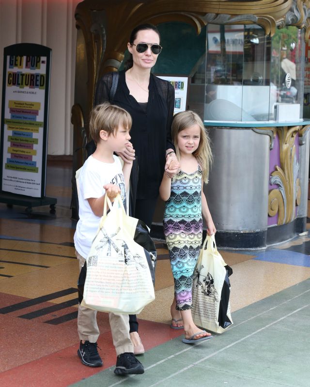 Vedeta de la Hollywood se ocupă intens şi de educaţia celor doi copii cumpărându-le cărţi. Copii au luat tot ce e mai frumos când vine vorba de trăsături. Angelina a ieşit un public, îmbrăcată sobru, în negru.