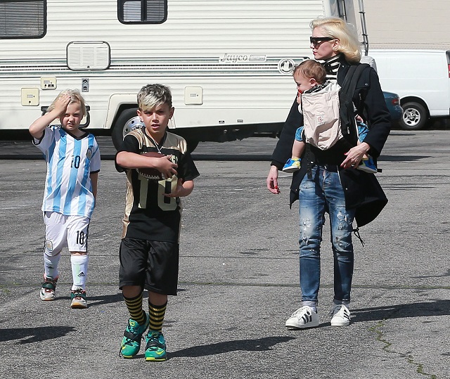 De curând, cântăreaţa a fost surprinsă cu în timp ce şi-a scos băieţii la un meci de fotbal, din California. Înainte de meci, Stefani şi-a dus băieţii la masă, iar căratul în braţe a micuţului Apollo i-a cam dat bătăi de cap, dar a avut un ajutor de nădejde în ceilalţi doi băieţi mai mari.