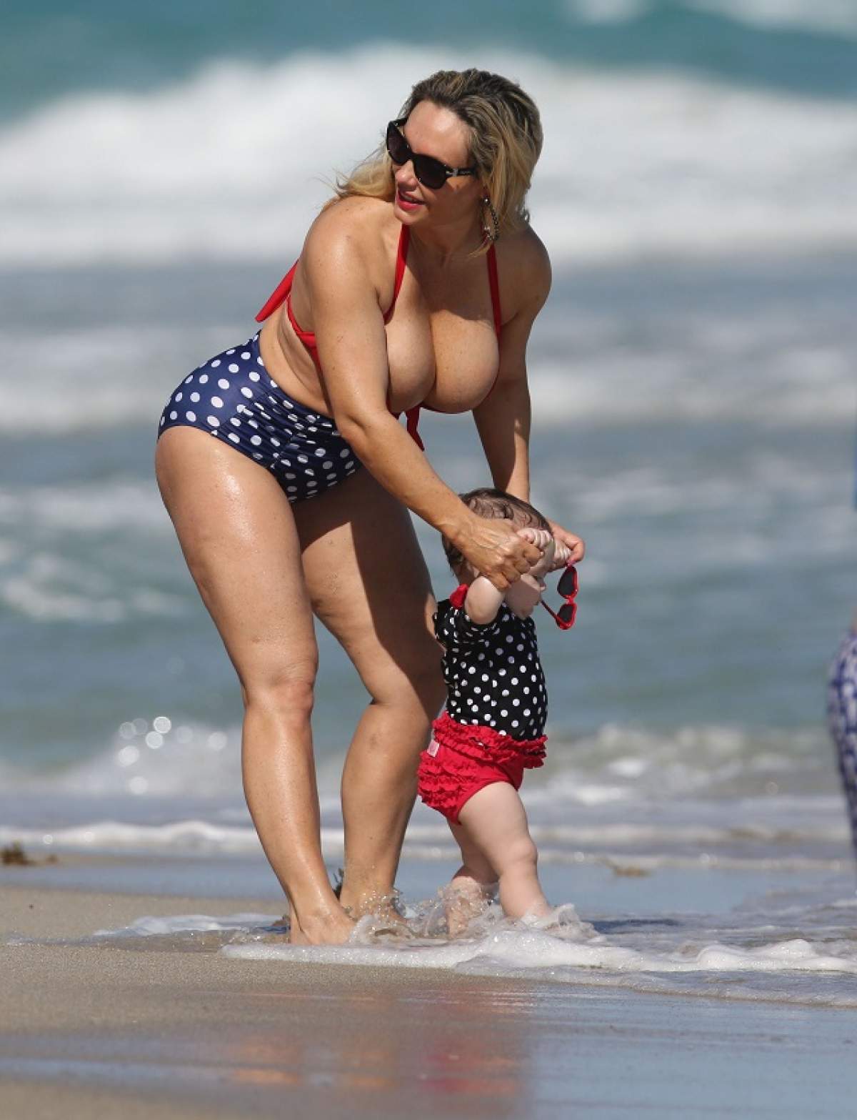 Coco Austin este cunoscută pentru felul în care arată, dar şi pentru faptul că este căsătorită cu un celebru artist. Aceasta a apărut pe plajă alături de copilul său, iar toţi au rămas uimiţi când au văzut-o. I-au ieşit sânii din sutien de faţă cu copilul.