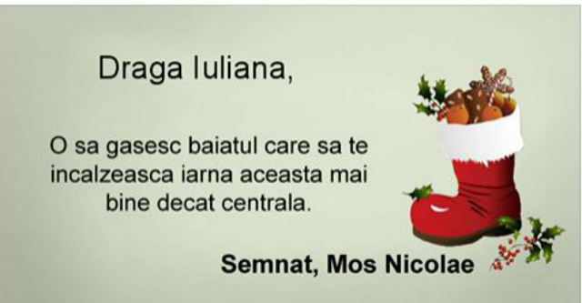 Pe reţelele de socializare, Iuliana Luciu a făcut public scrisoarea pe care Moş Nicolae i-a lăsat-o. "Dragă Iuliana,
