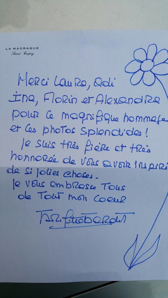 Brigitte Bardot a le-a scris Laurei şi fotografului o scrisoare în care apreciază profund fotografiile primite şi chiar le-a desenat o floare pe pagina scrisorii.