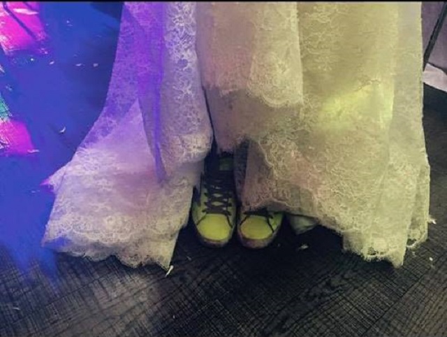 Celebra creatoare de modă care s-a căsătorit religios cu Alin Petrache sâmbătă a vrut să fie o apariţie spectaculoasă, aşa că şi-a pus în valoare rochia de mireasă clasică cu o pereche de tenişi, care au fost acoperiţi, evident, de faldurile rochiei spectaculoase.
