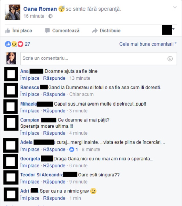 Internauţii, în doar câteva minute, s-au speriat şi au început să o încurajeze pe Oana să treacă peste greutăţile din viaţa: "Curaj, mergi înainte. Viaţa este plină de încercări", "Oare eşti singură?", "Capul sus! Mai avem multe de petrecut", "Ce Doamne ai mai pățit? Speranța moare ultima!".