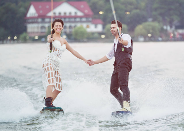 Patricia Cimpoiasu, frumoasa artista din trupa Amadeus, s-a maritat pe placa de wakeboard. Bruneta a imbracat rochia de mireasa si a pornit, alaturi de alesul ei, intr-o cursa plina de adrenalina pe lacul Snagov.