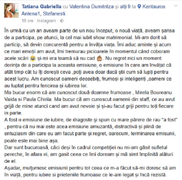 A fost o emisiune de iubire, de dragoste și spun cu mare părere de rau "a fost" , pentru că nu mai este acea emisiune amuzantă, distractivă și plină de entuziasm din care eu am facut parte și regret, oarecum, terminarea emisunii, poate este mai bine așa", a scris Tatiana pe contul său de socializare.