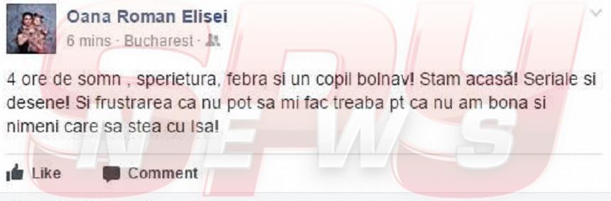Oana Roman nu trece prin clipe tocmai fericite. Nepoata fostului premier al ţării, Isabela, s-a îmbolnăvit, iar vedeta este nevoită să stea cu fiica ei acasă.