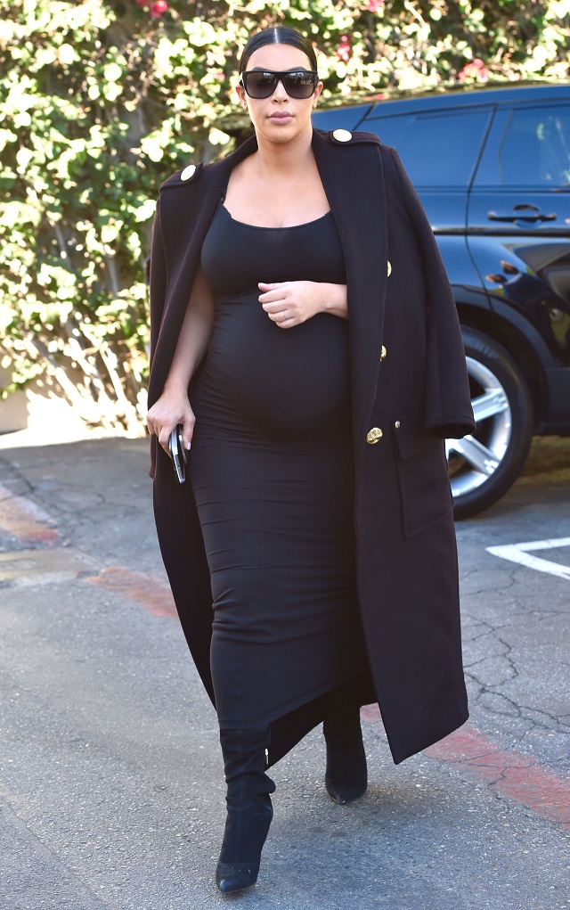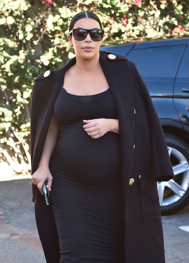 Conform celebritybabyscoop.com, fotografiile au fost făcute în Beverly Hills. Paparazzii au surprins-o cu o burtă mai mare decât un balon! Vedeta poartă o rochie maxi de gravidă, alături de un palton şi cizme. Kim era în drum spre locaţia unde avea să ia prânzul.