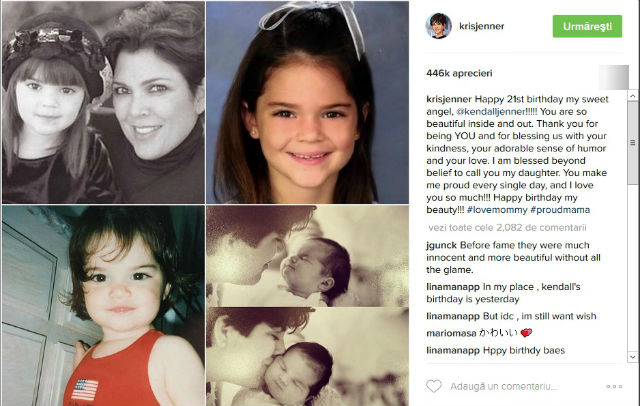 "Happy 21st birthday my sweet angel, @kendalljenner!!!!! You are so beautiful inside and out. Thank you for being YOU and for blessing us with your kindness, your adorable sense of humor and your love. I am blessed beyond belief to call you my daughter. You make me proud every single day, and I love you so much!!! Happy birthday my beauty!!! #lovemommy #proudmama (n.r.: La mulţi ani la aniversarea a 21 de ani, îngerul meu minunat, Kendall Jenner! Eşti atât de frumoasă la interior, dar şi la exterior. Îţi mulţumesc că eşti tu şi că ne binecuvântezi cu bunătatea ta, cu umorul tău adorabil şi iubirea ta. Sunt binecuvântată dincolo de credinţa de a te numi pe tine fiica mea. Mă faci mândră în fiecare zi şi te iubesc foarte mult!!! La mulţi ani, frumoasa mea!!! #iubireauneimămici #mamămândră", a scris mama lui Kendall Jenner, Kris Jenner.