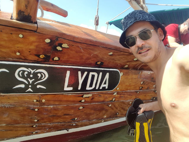 În cea mai recentă postare din vacanţa celor doi, Răzvan Simion a încărcat pe una dintre reţelele de socializare o fotografie în care "Lidia" apare scris pe barcă. Numele iubitei lui îl urmăreşte peste tot.