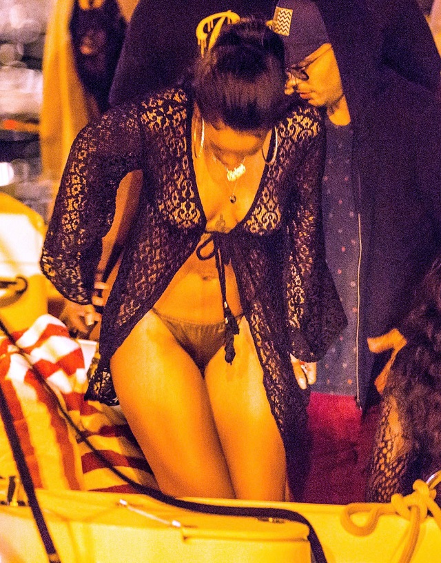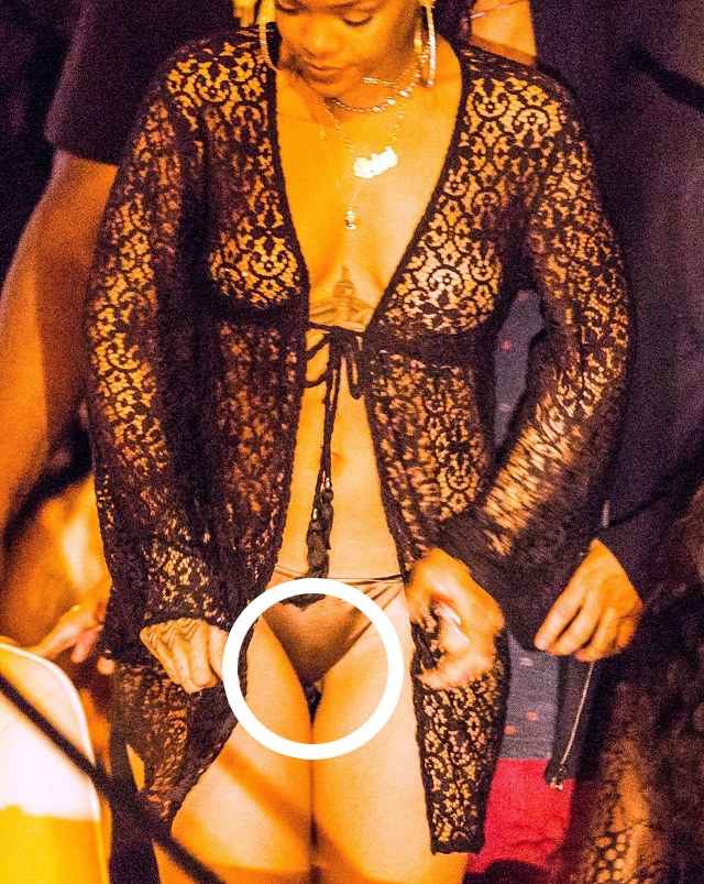 Rihanna a vrut să fie sexi la o petrecere pe un yacht din Insula Saint Barthélemy, aşa că s-a îmbrăcat foarte sumar, purtând doar o pereche de bikini negri şi o jachetă dintr-un material transparent. Din cauză că bikinii erau dintr-un material prea subţire, vedetei i s-a văzut "fericirea" în toată splendoarea ei.