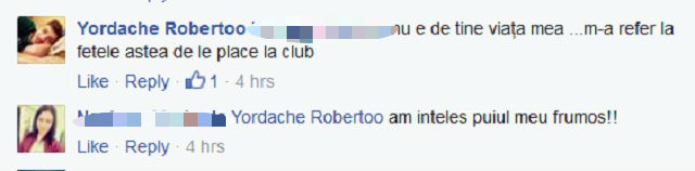 "În ziua de azi fetele nu mai preferă o plimbare în parc. Vor la club în loc de vată pe băţ şi înghețată", a scris Robert pe Facebook. Acesta e etichetat-o pe iubita lui şi i-a spus: "Nu e de tine viaţa mea. Mă refer la fetele astea cărora le place în club". Tânăra i-a răspuns: "Am înţeles, puiul meu frumos!".