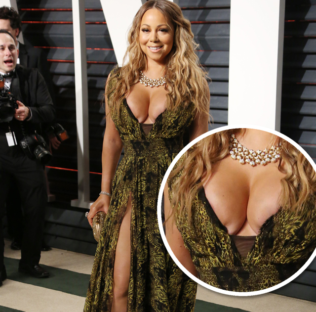 PREMIILE OSCAR 2017. Cântăreaţa de rang internaţional Mariah Carey a păşit pe covorul roşu îmbrăcată într-o rochie neagră cu inserţii neregulate de o culoare galbenă. Acest articol vestimentar i-a lăsat la vedere bustul foarte generos printr-un decolteu imens care i-a chinuit sânii. Din imagini se poate vedea că formele sale sunt sugrumate. Mai rău este că i se văd şi sfârcurile.