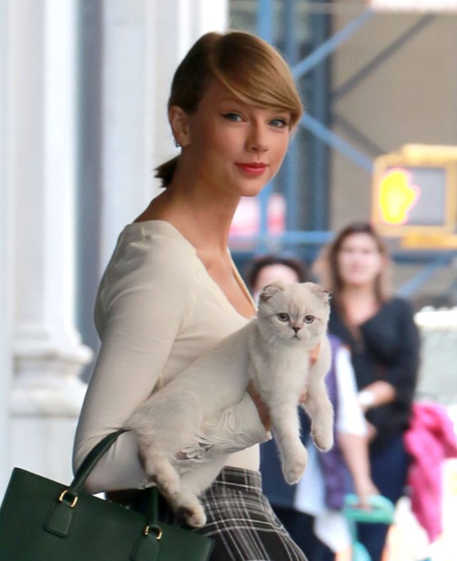Taylor Swift le-a zâmbit fotografilor de pe stradă, iar pisica a fost de-a dreptul intrigată. Felina a început să privească spre camerele foto extrem de insistent, aproape de intimidare.