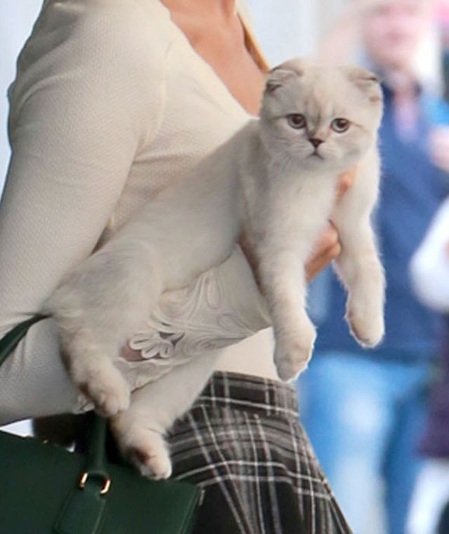 Artista a optat pentru un look inspirat de universităţile din Anglia, iar o pisică albă, pufoasă şi adorabilă fost accesoriul perfect al unei plimbări de după amiază, pe străzile metropolei.